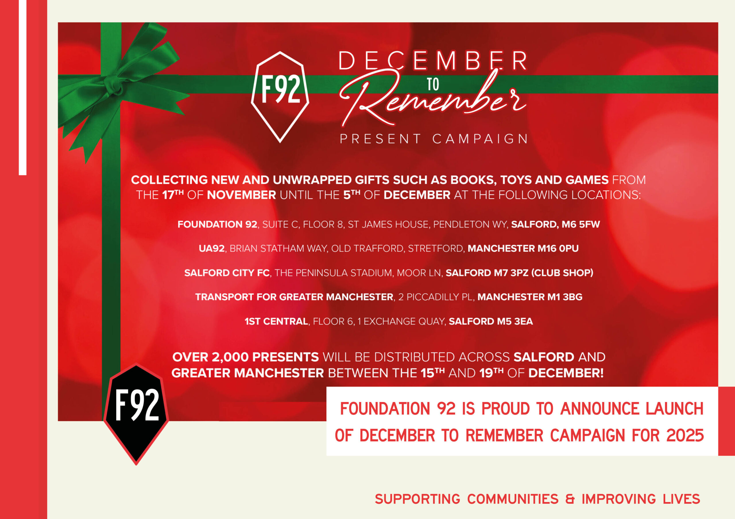 Foundation 92 is proud to announce launch of December to Remember campaign for 2025. The #DecembertoRemember campaign will be rolled out across Salford and Greater Manchester.